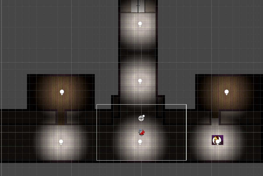 - Blocked out room layouts using simple tile-based lighting and grid spacing (Screenshot 2).
